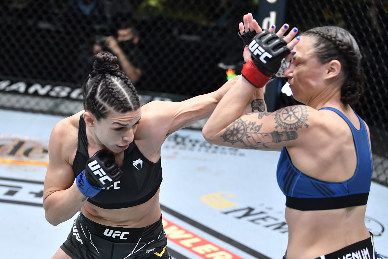 Speaking on the latest episode of MMA Fighting’s Portuguese-language podcast Trocação Franca, Dern admitted it would be foolish to walk away from her main weapon just to prove a point against the fellow Brazilian, who holds a 14-1-2 record in the sport with five knockouts.