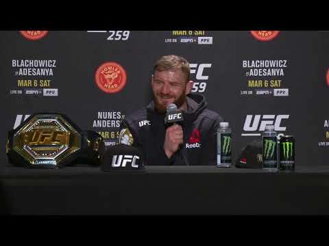 UFC light heavyweight champion Jan Blachowicz takes questions from the media after his first successful title defense over Israel Adesanya at UFC 259. Subscribe to get all the latest UFC content: http://bit.ly/2uJRzRR Experience UFC live with UFC FIGHT PASS, the digital subscription service of the UFC. Visit https://ufcfightpass.com/ To order UFC Pay-Per-Views on ESPN+, visit https://bit.ly/2vNIBE8 (U.S. only) To order UFC Pay-Per-Views, visit http://welcome.ufcfightpass.com/#PPV (Non U.S.) Connect with UFC online and on Social: Website: http://www.ufc.com Twitter: http://www.twitter.com/ufc Facebook: http://www.facebook.com/ufc Instagram: http://www.instagram.com/ufc Snapchat: UFC Periscope: http://Periscope.tv/ufc Connect with UFC FIGHT PASS on Social: Twitter: http://www.twitter.com/ufcfightpass Facebook: http://www.facebook.com/ufcfightpass Instagram: http://www.instagram.com/ufcfightpass #UFC259 View the original article