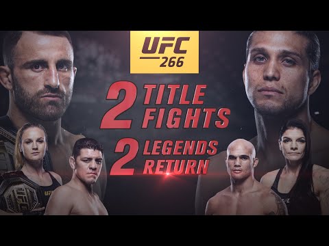 Fresh from a pair of victories over Max Holloway, UFC featherweight champion Alexander “The Great” Volkanovski defends his crown against his recent coaching rival from The Ultimate Fighter, Brian “T-City” Ortega, in the main event of UFC 266 at Las Vegas’ T-Mobile Arena on September 25. In the co-main event, one of the UFC’s most dominant champions puts her belt on the line once again, as flyweight champion Valentina Shevchenko battles veteran contender Lauren Murphy. Plus, it’s a rematch nearly two decades in the making as Nick Diaz returns to the Octagon to battle former world champion Robbie Lawler. Subscribe to get all the latest UFC content: http://bit.ly/2uJRzRR Experience UFC live with UFC FIGHT PASS, the digital subscription service of the UFC. Visit https://ufcfightpass.com/ To order UFC Pay-Per-Views on ESPN+, visit https://bit.ly/2vNIBE8 (U.S. only) To order UFC Pay-Per-Views, visit http://welcome.ufcfightpass.com/#PPV (Non U.S.) Connect with UFC online and on Social: