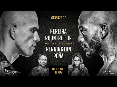 UFC 307: Pereira vs Rountree Jr – Saturday, October 5 – 10pm ET / 7pm PT start. One of UFC’s busiest and most dominant champions, Alex Pereira, puts his light heavyweight title on the line against fellow knockout artist Khalil Rountree Jr. at UFC 307. Fresh from knockouts over former champions Jiri Prochazka in July and Jamahal Hill in April, Brazil’s “Poatan” is in fearsome form as he prepares to battle Rountree, who brings a five-fight winning streak into the biggest fight of his career. Plus, Raquel Pennington defends her bantamweight crown for the first time against former champion Julianna Peña in the co-main event. UFC 307– Saturday, September 14th, live on Pay-Per-View *Purchase includes viewing for 24 hours from the event start* Don't miss the early prelims on UFC Fight pass. Sign-up at https://ufc.ac/3ytKCE6 Subscribe to get all the latest UFC content: https://ufc.ac/3u8FIJp Experience UFC live with UFC FIGHT PASS, the digital subscription service of the UFC. Visit https://ufcfightpass.com/ ๐ Shop official UFC Gear, visit https://ufcstore.com