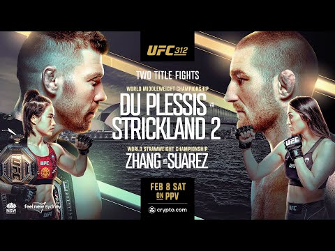 UFC 312: Du Plessis vs Strickland 2 | Saturday – February 8 – 10p ET / 7p PT UFC returns down under to Sydney, Australia on February 8, and all eyes will be on Quodos Bank Arena when middleweight champion Dricus Du Plessis defends his crown against the man he took it from, Sean Strickland, in the main event of UFC 312. The first time this pair met last January, it was one of the best fights of 2024 as Du Plessis defeated Strickland by a narrow split decision. Now they’ll run it back in Sydney. Plus, dominant strawweight champion Zhang Weili will put her belt on the line against unbeaten Tatiana Suarez in a highly anticipated title fight. Live on Pay-Per-View *Purchase includes viewing for 24 hours from the event start* Don't miss the early prelims on UFC Fight pass. Sign-up at https://ufc.ac/3ytKCE6 Subscribe to get all the latest UFC content: https://ufc.ac/3u8FIJp Experience UFC live with UFC FIGHT PASS, the digital subscription service of the UFC. Visit https://ufcfightpass.com/ ๐Ÿ‘‰ Shop official UFC Gear, visit https://ufcstore.com