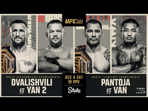 The UFC’s final pay-per-view of the year wraps with a captivating clash for the bantamweight title as champion Merab “The Machine” Dvalishvili seeks to make his fourth successful title defense of the year as takes on former titleholder Petr “No Mercy” Yan, who has won three straight, in the main event of UFC 323 on Saturday, December 6 at T-Mobile Arena in Las Vegas. In the co-main event, flyweight ruler Alexandre “The Cannibal” Pantoja put his belt and eight-fight winning streak on the line against surging challenger Joshua “The Fearless” Van, who earned impressive victories over Bruno Silva and Brandon Royval in June to cement his standing as the No. 1 contender in the 125-pound weight class. UFC 323: Dvalishvili vs Yan 2 – Saturday, December 6th Live on Pay-Per-View *Purchase includes viewing for 24 hours from the event start* Don't miss the early prelims on UFC Fight pass. Sign-up at https://ufc.ac/3ytKCE6 Subscribe to get all the latest UFC content: https://ufc.ac/3u8FIJp Experience UFC live with UFC FIGHT PASS, the digital subscription service of the UFC. Visit https://ufcfightpass.com/ πŸ‘‰ Shop official UFC Gear, visit https://ufcstore.com