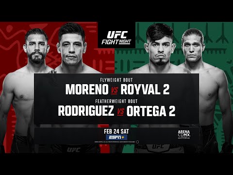 The UFC returns to Mexico City as top flyweight contenders headline a stacked card on February 24th, 2024. Brandon Moreno and Brandon Royval meet in the main event in a rematch four years in the making. And, in the co-main event Yair Rodriguez and Brian Ortega run it back after an unfortunate injury stopped their first bout short. Main card action kicks off on Saturday at 10pm ET / 7pm PT. Subscribe to get all the latest UFC content: https://ufc.ac/3u8FIJp Experience UFC live with UFC FIGHT PASS, the digital subscription service of the UFC. Visit https://ufcfightpass.com/ To order UFC Pay-Per-Views on ESPN+, visit https://ufc.ac/3NKBvmx (U.S. only) To order UFC Pay-Per-Views, visit http://welcome.ufcfightpass.com/#PPV (Non U.S.) ???? Shop official UFC Gear, visit https://ufcstore.com