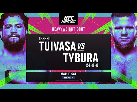 The UFC returns to APEX as heavyweight contenders go head-to-head on March 16th, 2024. Octagon personality, Tai Tuivasa faces off against Poland's Marcin Tybura. Main card action kicks off on Saturday at 7pm ET / 4pm PT. Subscribe to get all the latest UFC content: https://ufc.ac/3u8FIJp Experience UFC live with UFC FIGHT PASS, the digital subscription service of the UFC. Visit https://ufcfightpass.com/ To order UFC Pay-Per-Views on ESPN+, visit https://ufc.ac/3NKBvmx (U.S. only) To order UFC Pay-Per-Views, visit http://welcome.ufcfightpass.com/#PPV (Non U.S.) ???? Shop official UFC Gear, visit https://ufcstore.com
